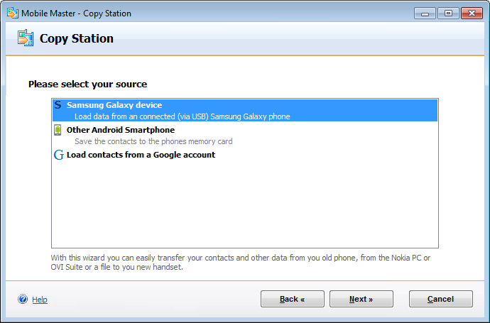 Load the contacts and other data from a connected Samsunug Galaxy handset, or import the contacts from any other Android smartphone and transfer your address book e.g. to your new iPhone or another Android smartphone.